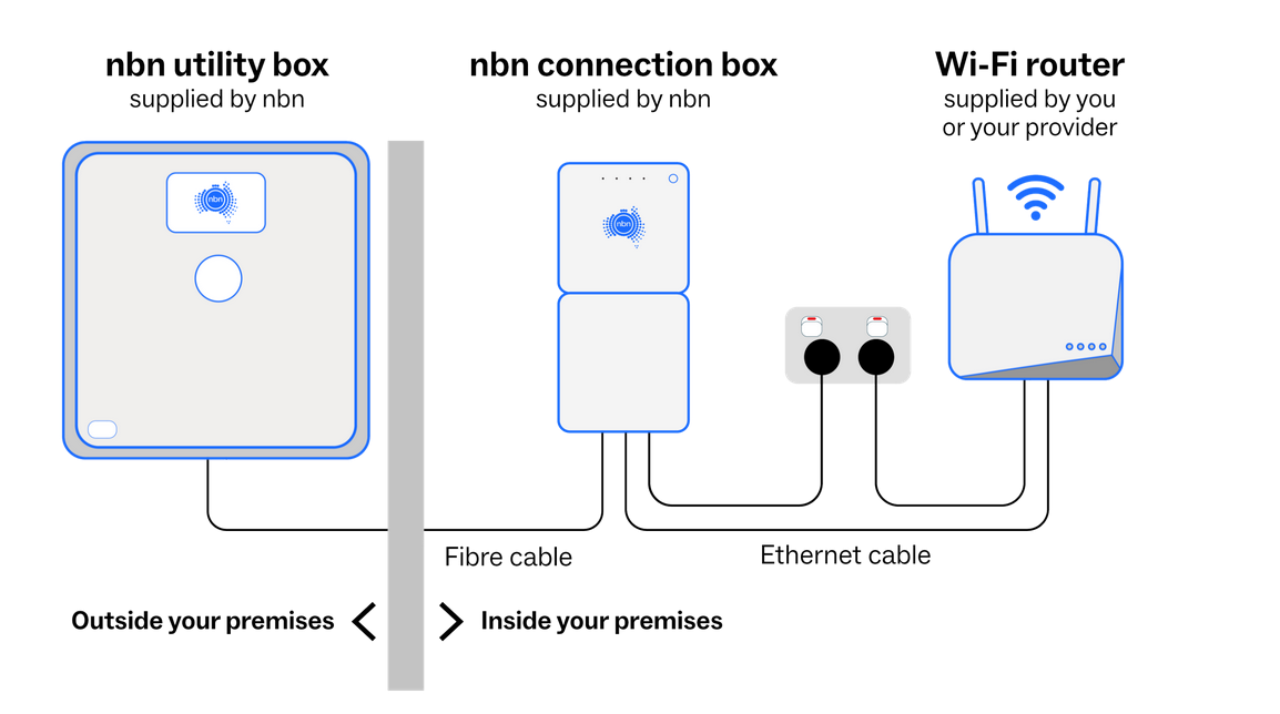 Fibre to the Premise (FTTP) involves fibre optic cables used for data transfer at every point through the nbnâ„¢ network. The fibre cable is connected directly to a utility box on the outside of the premises, which in turn is connected to an nbnâ„¢ connection box inside your house.