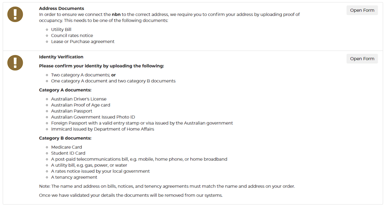 If you are placing an order for NBN, our network provider may require additional information or documents. Here are some of the information/files needed: