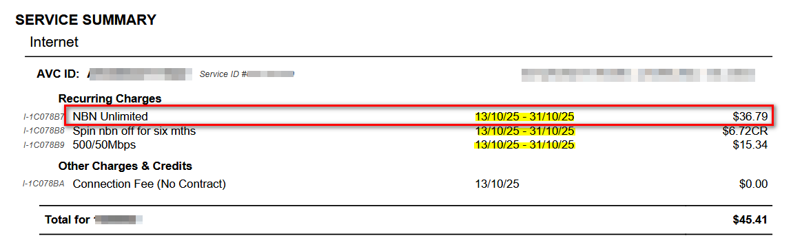 When your service is first activated, your initial bill will include a pro-rata charge to align your billing with our standard billing cycle. This means you'll only be charged for the portion of the service used between your activation date and the end of that billing cycle.